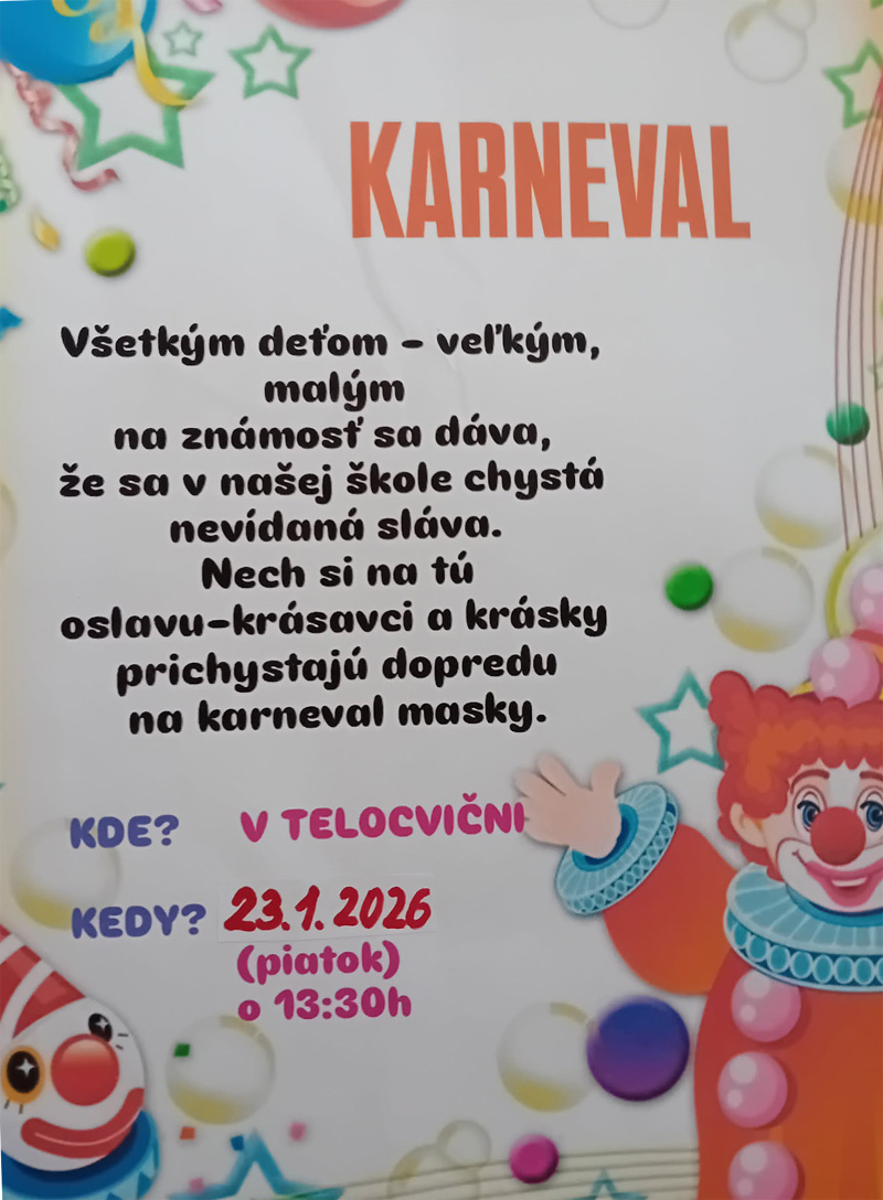 Dňa 23. januára 2026 (bude to v piatok) o 1330 hod., sa v telocvični našej školy uskutoční váš obľúbený a očakávaný karneval. Preto si už teraz môžete pripravovať masky a dobrú náladu.